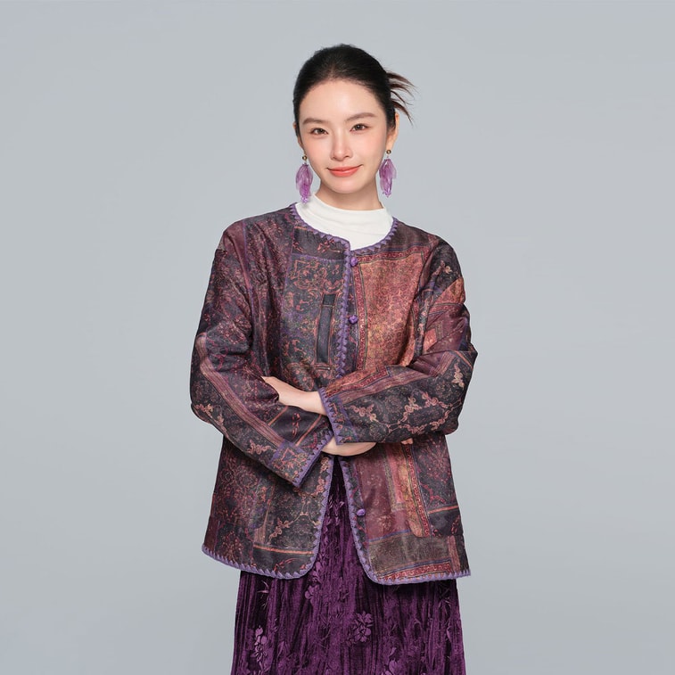 New Chinese style silk fragrant cloud gauze jacket for women long sleeved round neck retro winter new top gray purple M