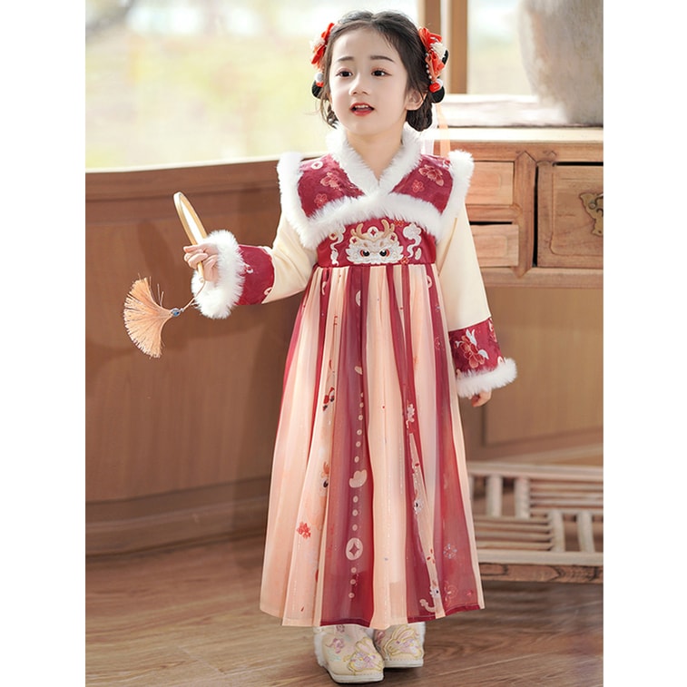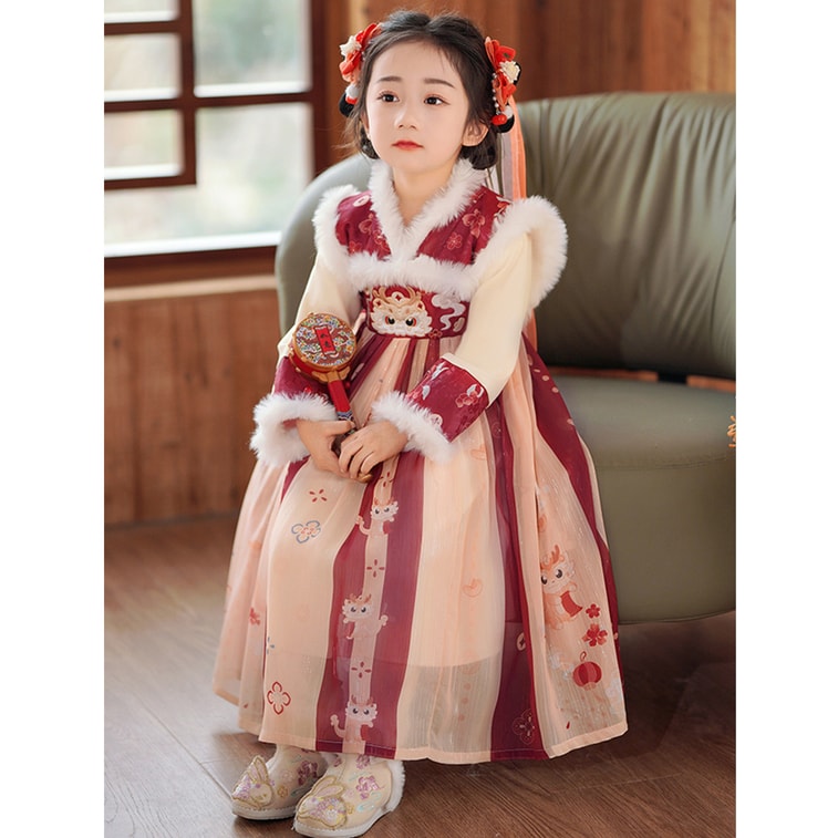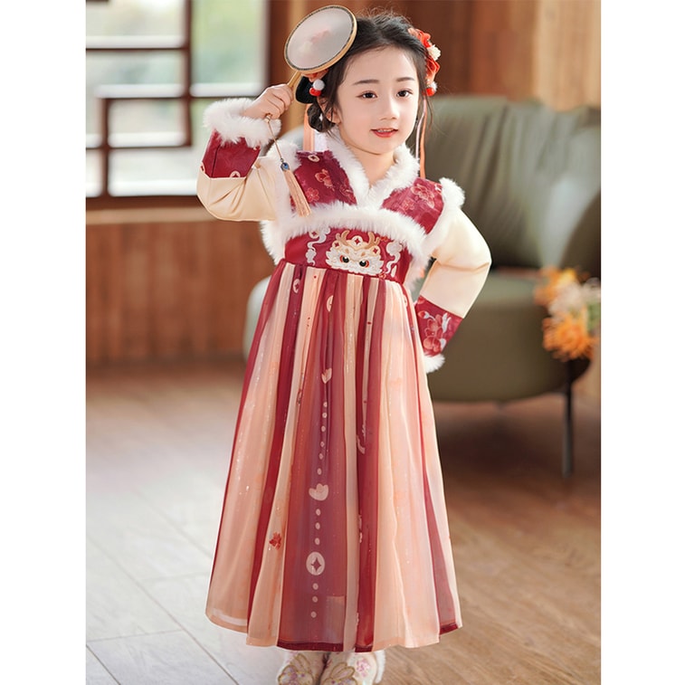 New Girls' Cute And Festive Chinese Style Velvet Hanfu Dress Red 100
