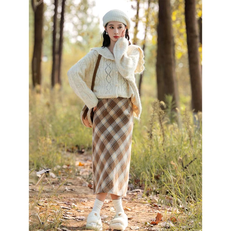 New Plaid Woolen High Waisted Skirt With Color Grid Pattern S