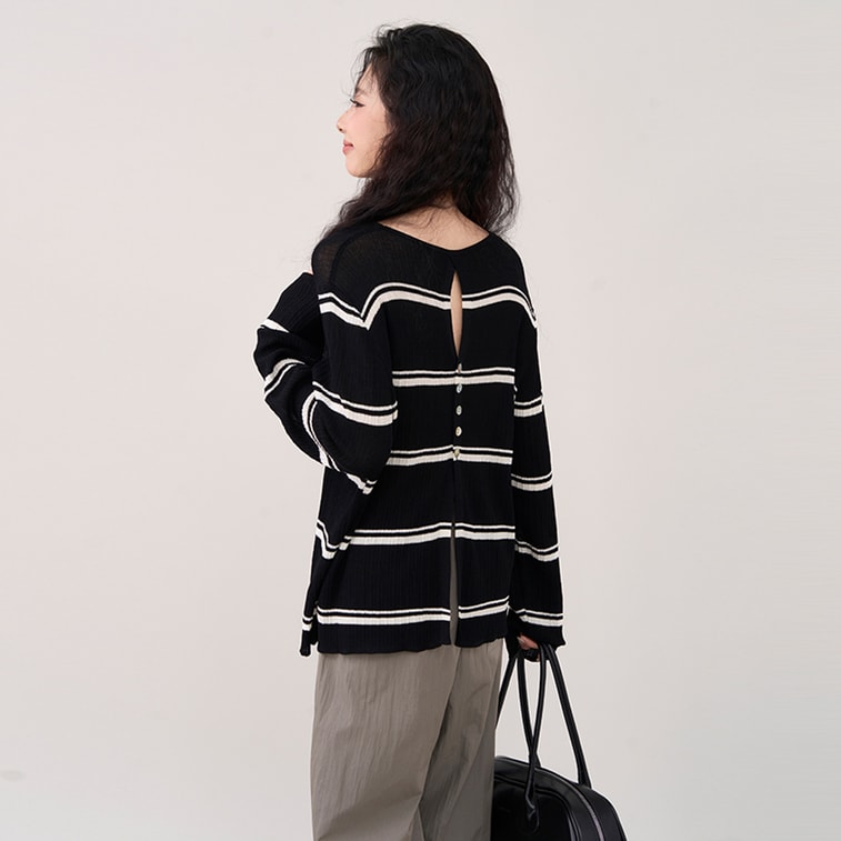 New Retro Design Striped Knitted Sunscreen Long Sleeved Cover Shirt White Stripes F | Yami