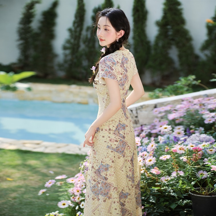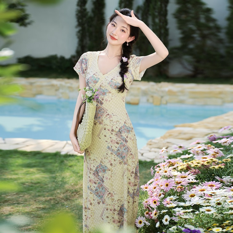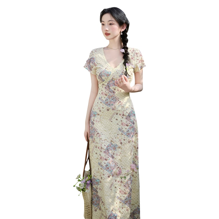New Retro Style High-end V-neck Slimming Dress Beige Floral Lace S | Yami
