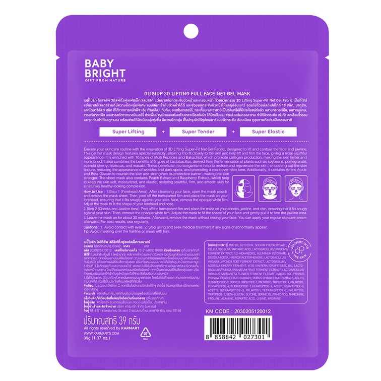 Elevate your skincare routine with the innovation of 3D Lifting Super-Fit Net Gel Fabric, designed to lift and contour the face and jawline. This gel net mask design features special elasticity, allowing it to fit closely to the skin and help lift and firm the face, giving a more youthful appearance. It is enriched with 10 types of Multi Peptides and Bakuchiol, which promote collagen production, making the skin firmer and more toned. It also combines the benefits of 5 types of Lactobacillus, derived from the fermentation of plants such as soybeans, pomegranate, acerola cherry, hibiscus, and wasabi. These beneficial microorganisms help to restore and rejuvenate the skin, smoothing out the skin texture, reducing the appearance of wrinkles and dark spots, and promoting a more even skin tone. Additionally, it contains Amino Acids and Beta-Glucan to nourish the skin and strengthen its protective barrier, making the skin stronger. The sheet mask also contains Peach Extract and Raspberry Extract, which help to keep the skin soft, moisturized, and elastic, restoring youthful, firm, and smooth skin for a naturally healthy-looking complexion.