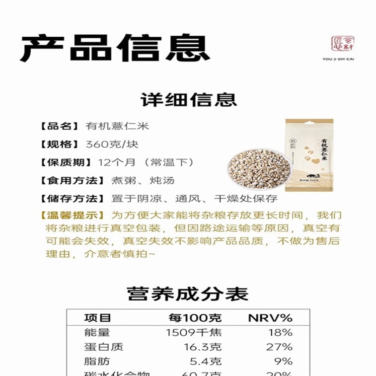 Organic coix seed 360g per bag, new Northeast small coix seed, raw coix seed porridge soak