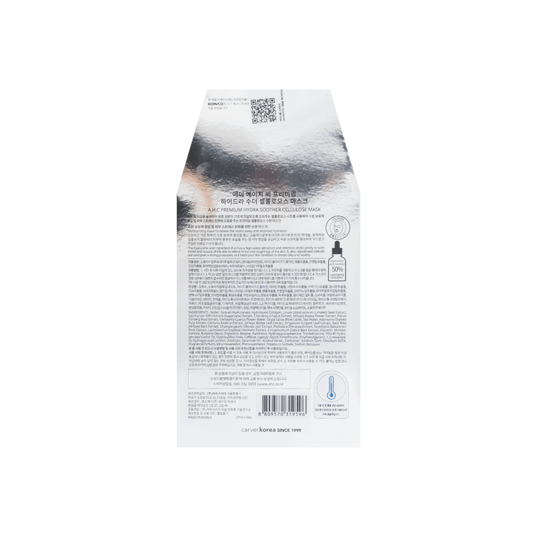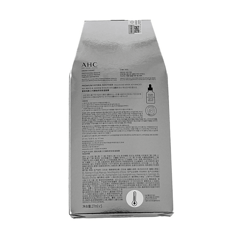 A.H.C Premium Hydra Soother Cellulose Mask is a luxurious facial mask infused with abundant moisture that keeps skin hydrated and supple. The facial mask is soaked in rich essence that contains 50% hyaluronic acid which has the ability to hold an immense amount of moisture in skin to penetrate pores to plump up the skin. Formulated with enriching ingredients such as concentrated collagen to prevent the deformation of elastic cells in skin and form a protective veil to retain skin's vitality. In addition to hydration, essence is also formulated with various vitamins and citrus extract to brighten and energize complexion. Skin should feel a soothing cool sensation as nutrients rejuvenate skin with hydration and nourishment. The mask also provides a veil of protection against harsh external elements that may cause damage to skin.