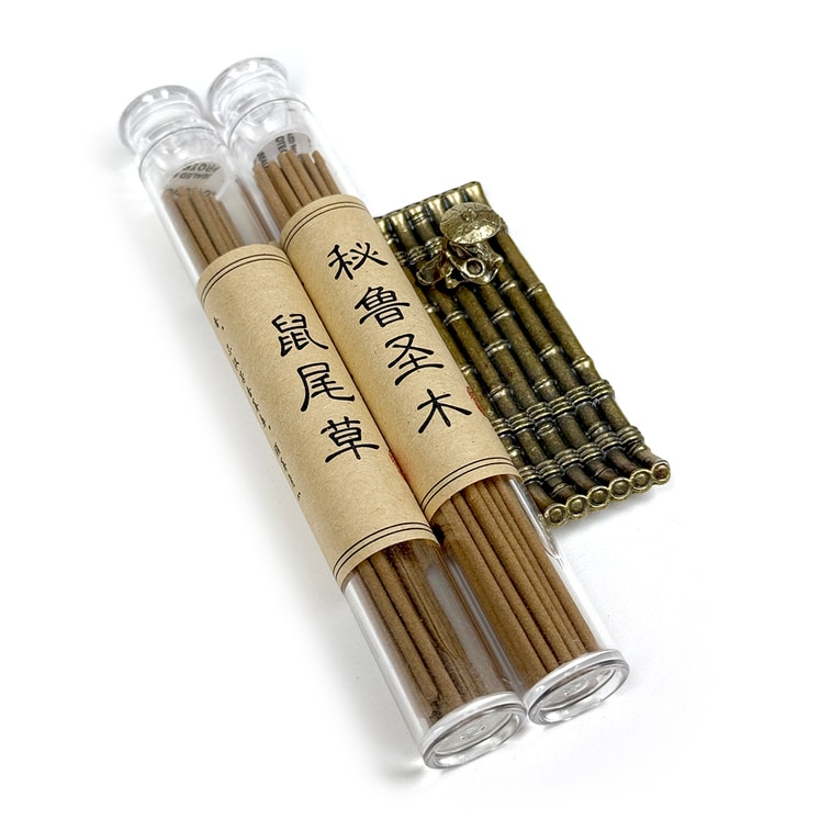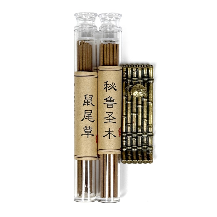 This set includes two bottles of carefully selected natural incense in classic scents: Peruvian Palo Santo and Sage. Each bottle contains approximately 30 sticks, each about 10.5 cm in length, releasing a rich and pure fragrance that soothes the mind and purifies the air. The set also comes with a beautifully crafted incense holder, designed for easy lighting and safe placement, adding a touch of elegance to your space.