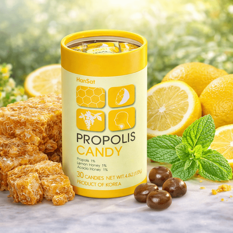 UMEKEN Propolis candy are crafted with a refreshing blend of propolis, lemon, and mint, delivering a smooth and pleasant taste while helping keep your throat feeling comfortable and refreshed. The natural ingredients combine the mild sweetness of propolis, the bright citrus flavor of lemon, and the cooling sensation of mint to help soothe and moisten the throat while keeping your breath fresh.