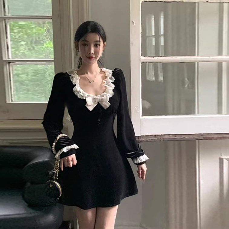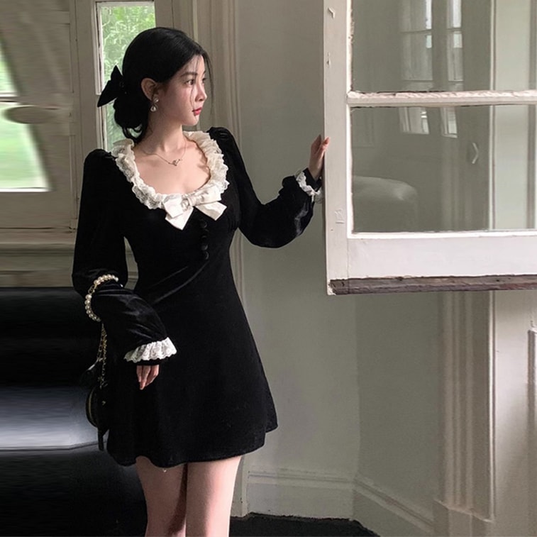 Rich Girl Retro Birthday Party Mini Dress Wearable Daily Bow Velvet Dress Black M