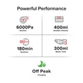 1.Based on internal testing carried out by the manufacturer according to IEC 62885-2:2016 / 5.8 standards, using Max+ mode with a full battery. Actual results may vary according to the home environment.