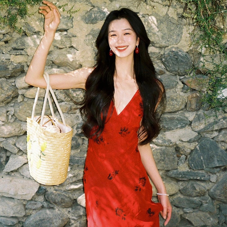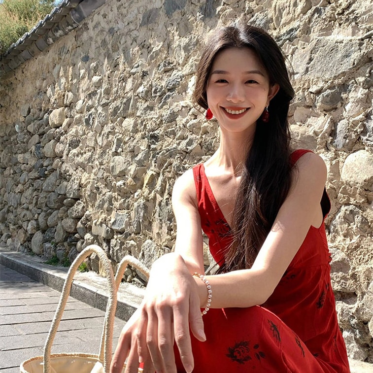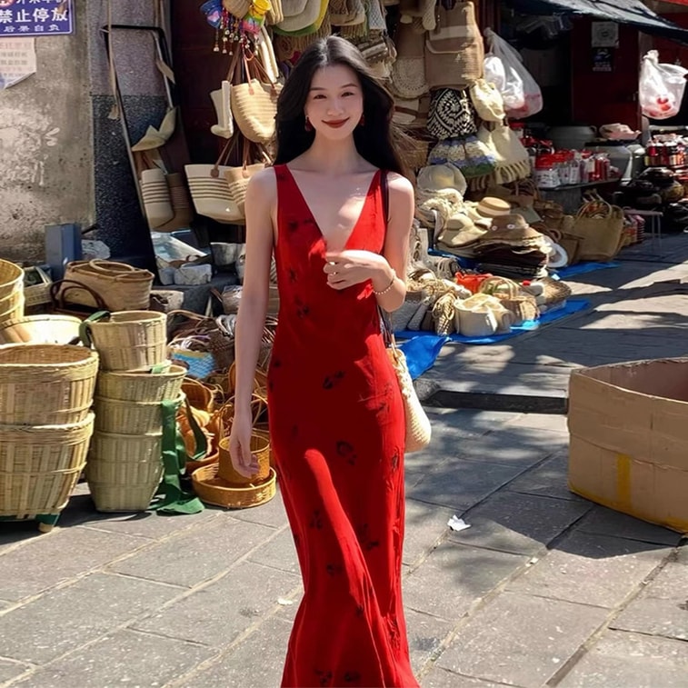 Rose red V-neck elegant waist-fitted hip-hugging slip dress vacation dress Red XS 1 piece | Yami