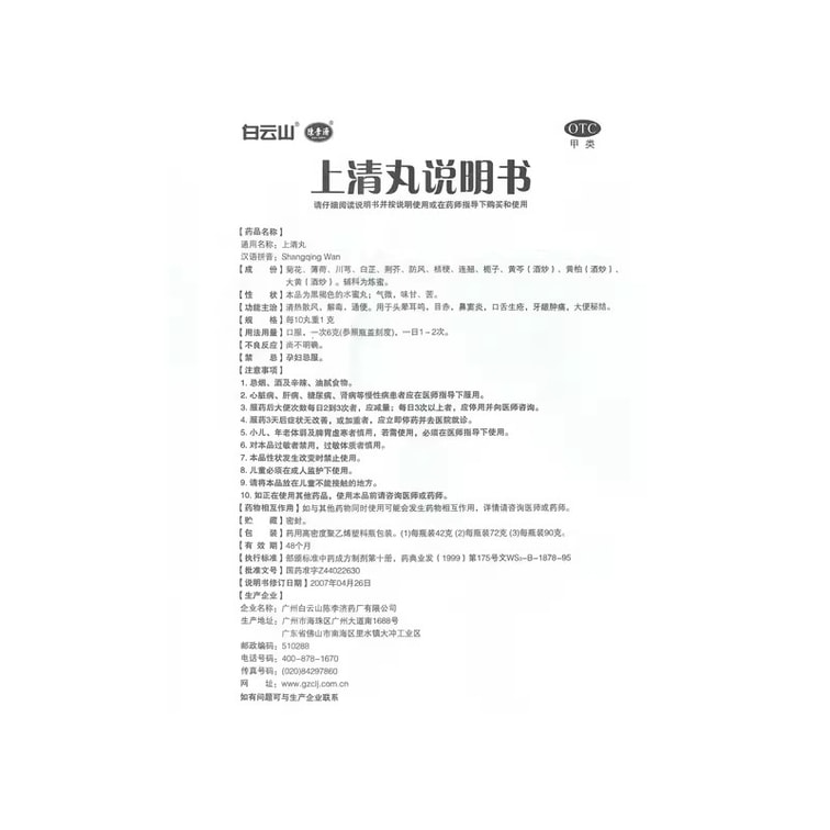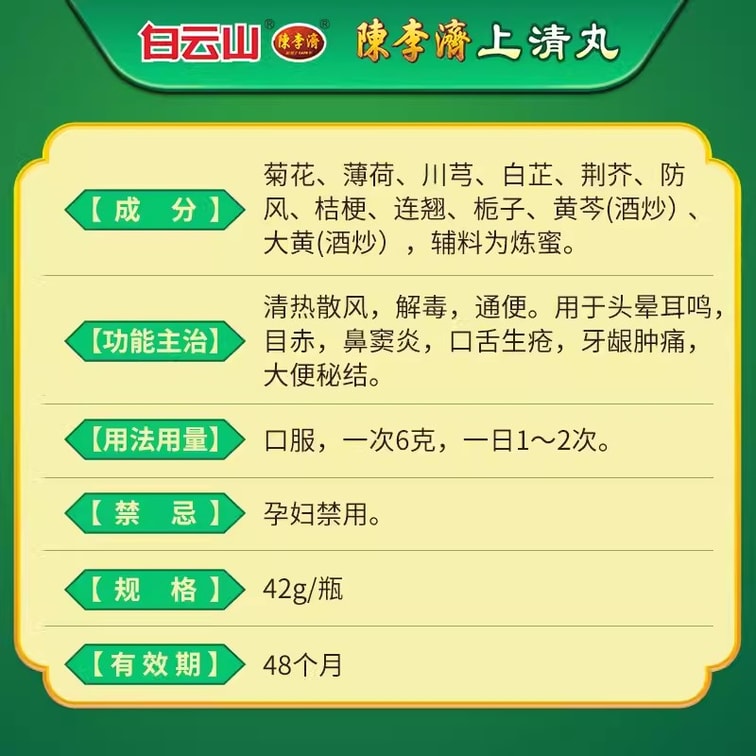 Shang Qing Pill Is Suitable For Upper Fire Dizziness Headache Constipation Oral And Tongue Sores 42G*1 Bottle/Box