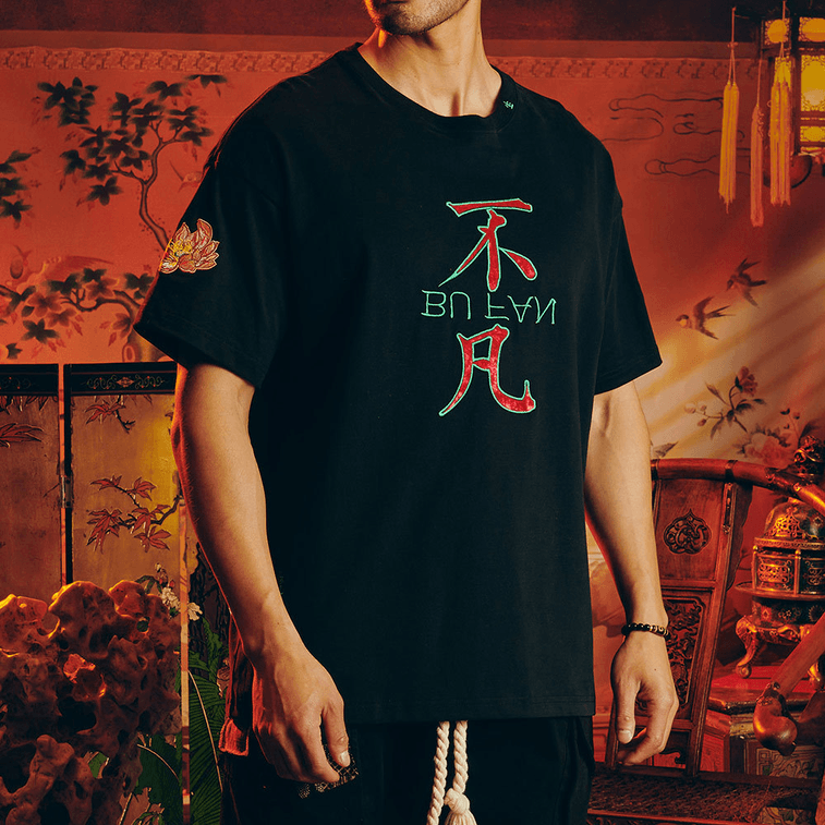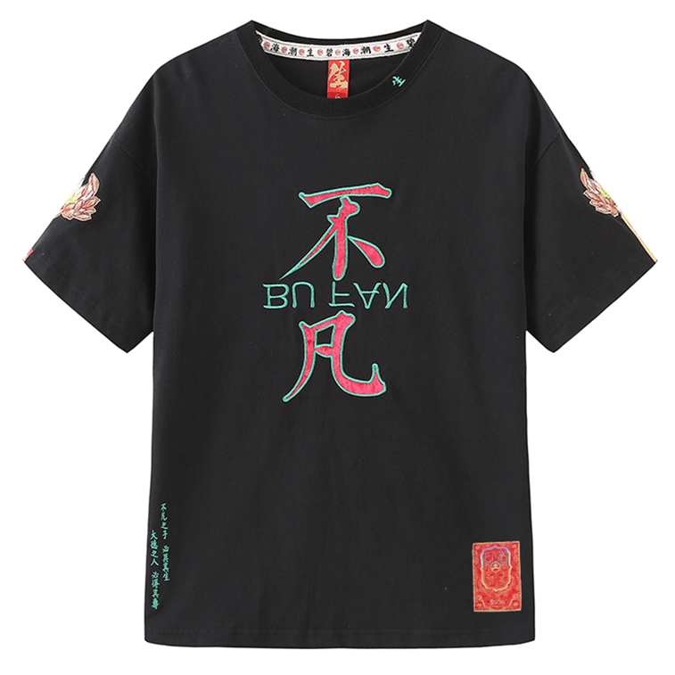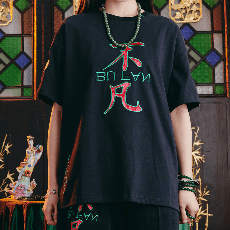Chinese BuFan Text Printed Loose Cotton Short Sleeve T-shirt For Women Men XX-Large