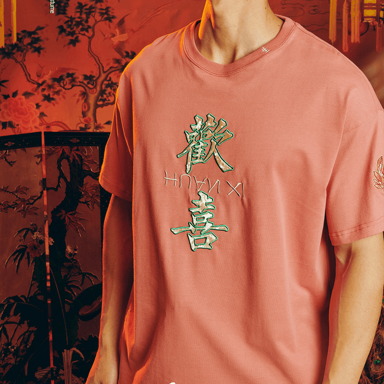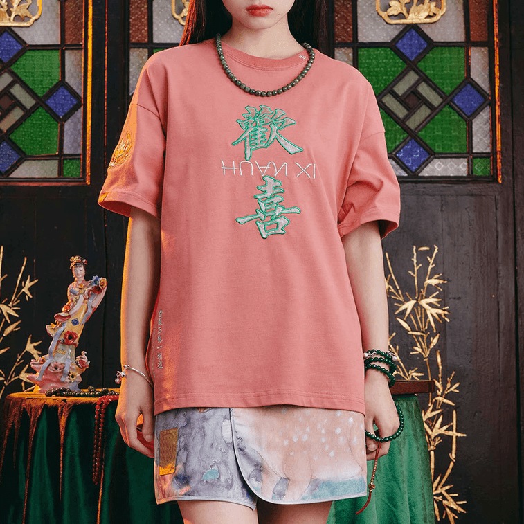 Chinese HuanXi Text Printed Loose Cotton Short Sleeve T-shirt For Women Men XX-Large