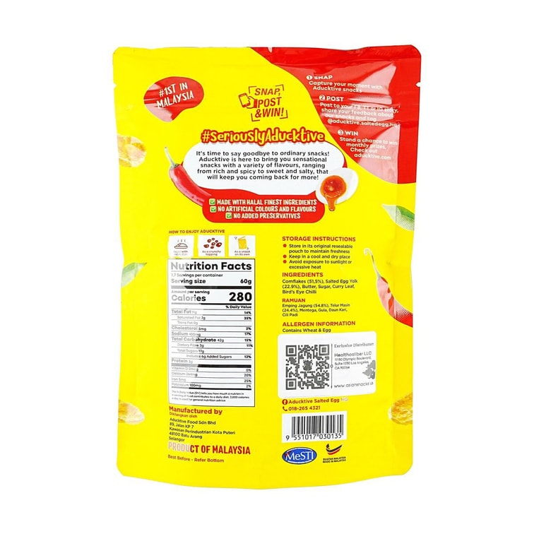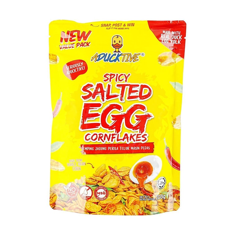 Crispy Salted Egg Cornflakes are savoury, sweet, salty, crunchy and sometimes spicy! They are a delicious and very popular Lunar New Year snack in Singapore and Malaysia. Once you start, you can't stop! Our salted egg products are carefully crafted to provide a rich and spicy taste, bringing the trending salted egg taste to a whole new level. The name ‘Aducktive’ is created from the combination of ‘duck egg yolk’ and ‘addictive’. Seriously Aducktive!