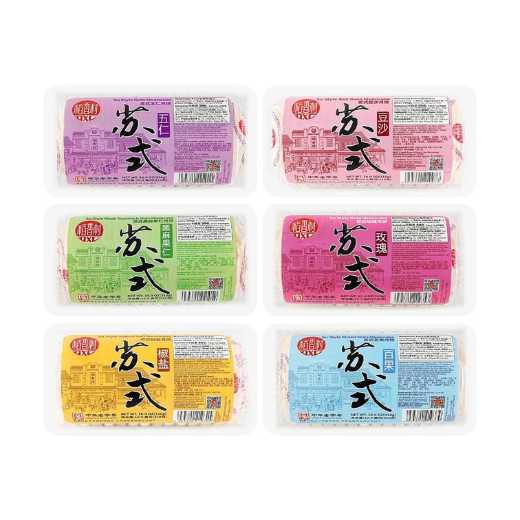 Suzhou Traditional Mooncakes,Red Bean+Black Sesame+Spiced Salt+Rose+Mixed Nuts+Five Nuts ,10.9oz*6【6 Flavor Combo Packs】