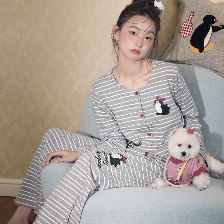 Sweetheart Penguin 100% Cotton Pajamas for Women Long Sleeve Casual Striped Cartoon Loungewear Spring Autumn - Grey Stripes Size M 1 Piece
