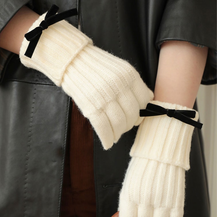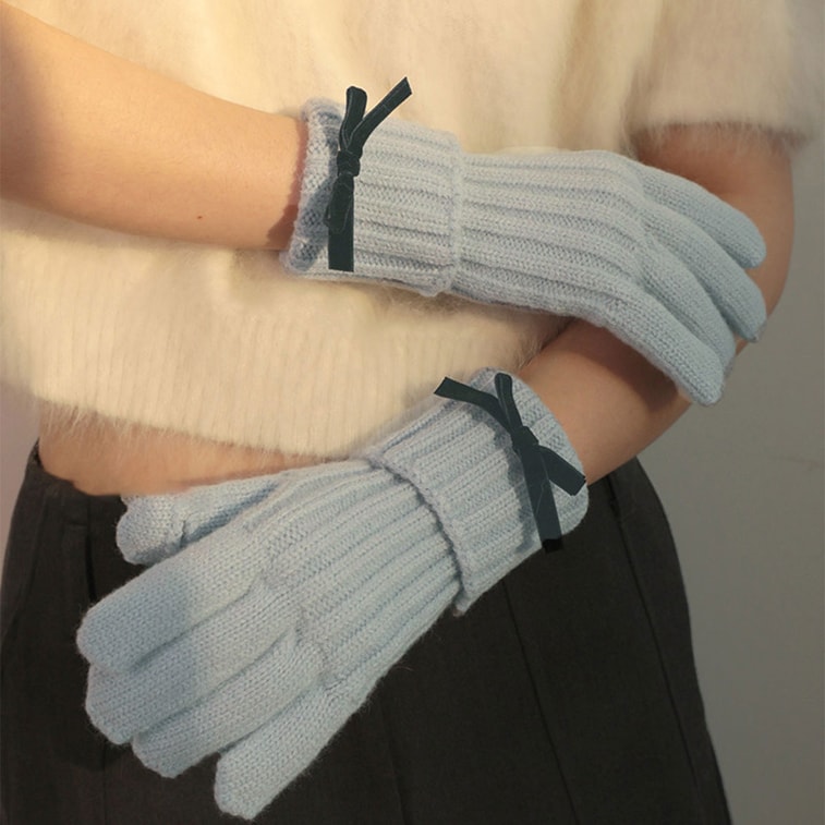 Thickened Detachable Bow Knitted Gloves Warm Five-Finger Touchscreen-Compatible Outdoor Winter Gloves 1 Piece Grey