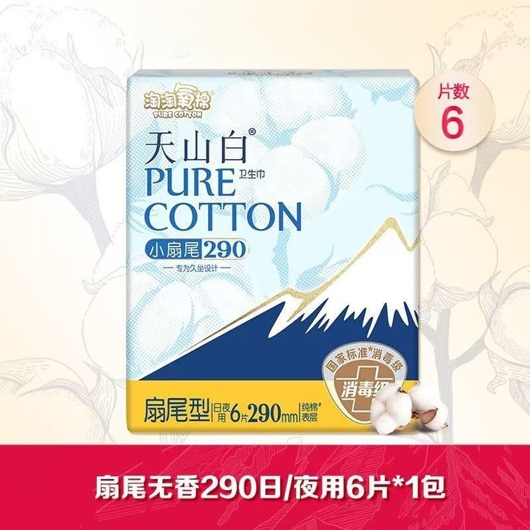 Tianshan Bai Sanitary Pads Fan Tail Day & Night Use 290mm, 6 Pads/Pack Sterilized Grade Sanitary Pads