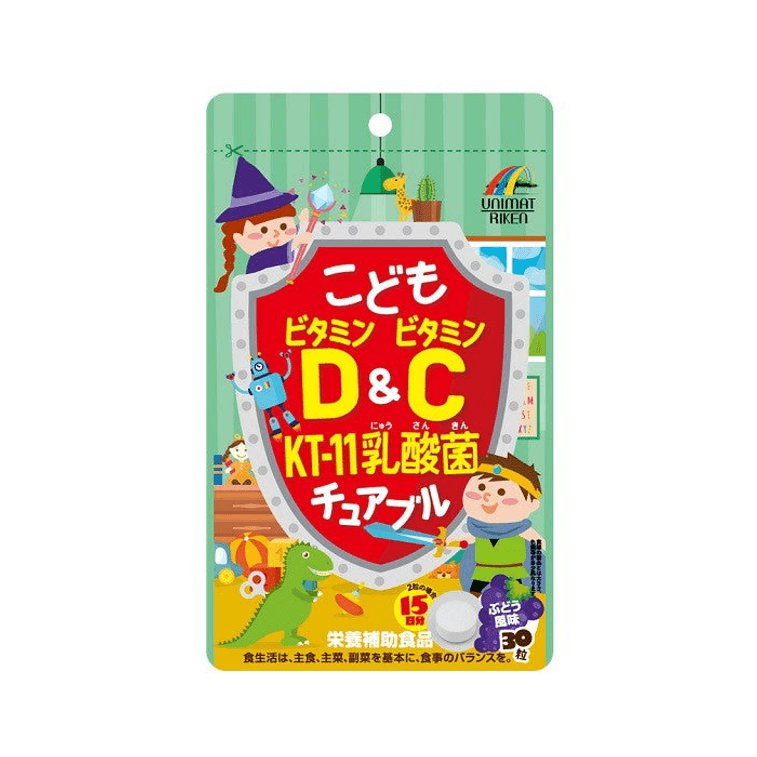 A grape-flavored chewable that provides 5.5 μg of vitamin D, 100 mg of vitamin C, and 200 million KT-11 probiotics per 2 tablets daily.