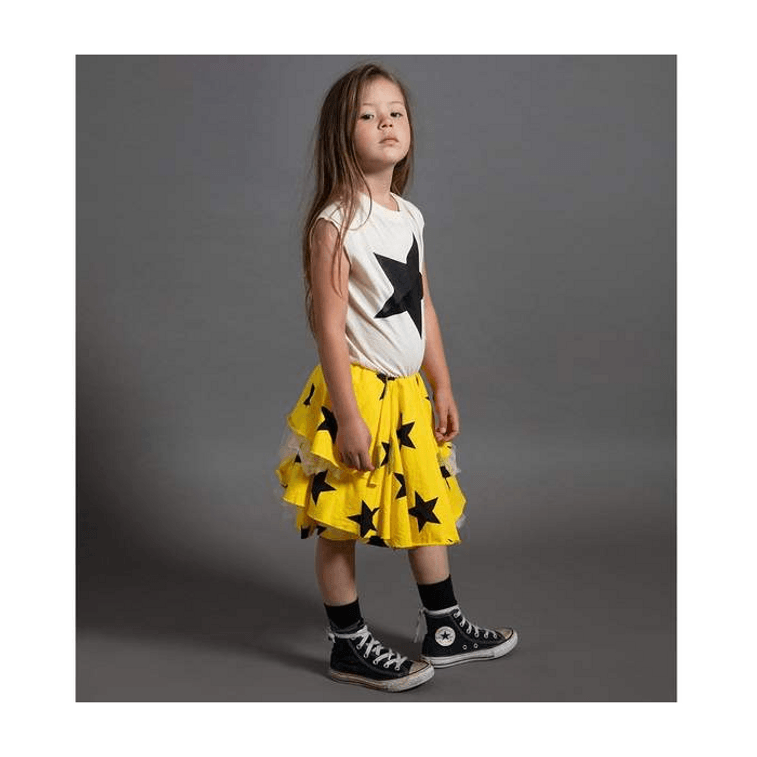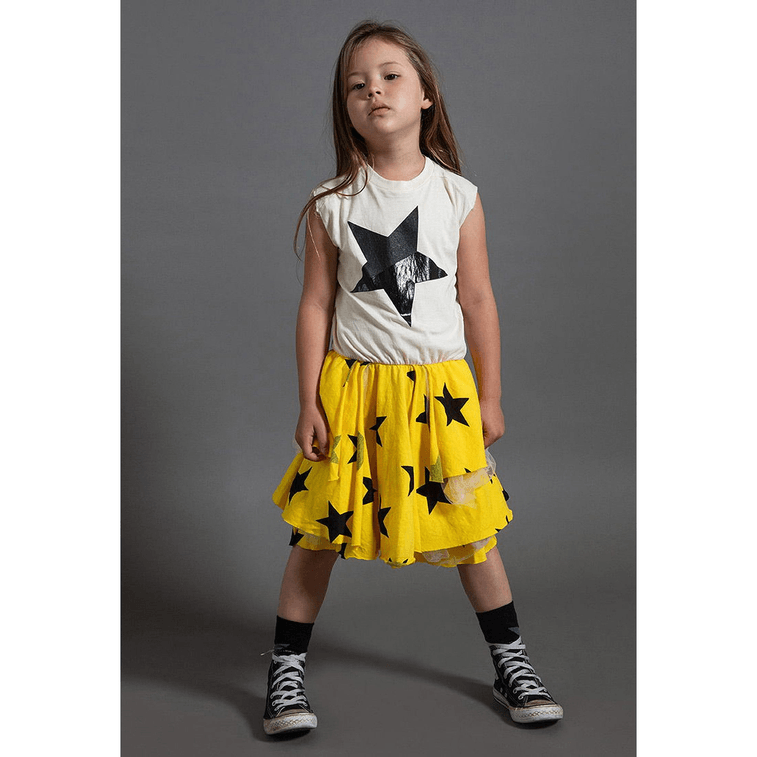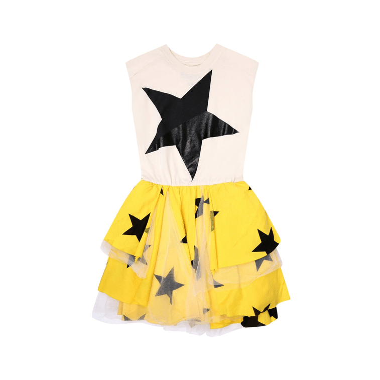our beloved star print takes on a new life on this awesome lava yellow & natural sleeveless dress. the top is a muscle tee with raw-edged armholes, and it descends into a tutu effect on the bottom. layers of light jersey mix with tufts of tulle for a slightly puffy feel that is frilly but not fussy. pair it with chucks for a grunge moment, or maybe ballet flats if your girl is feeling more ladylike.