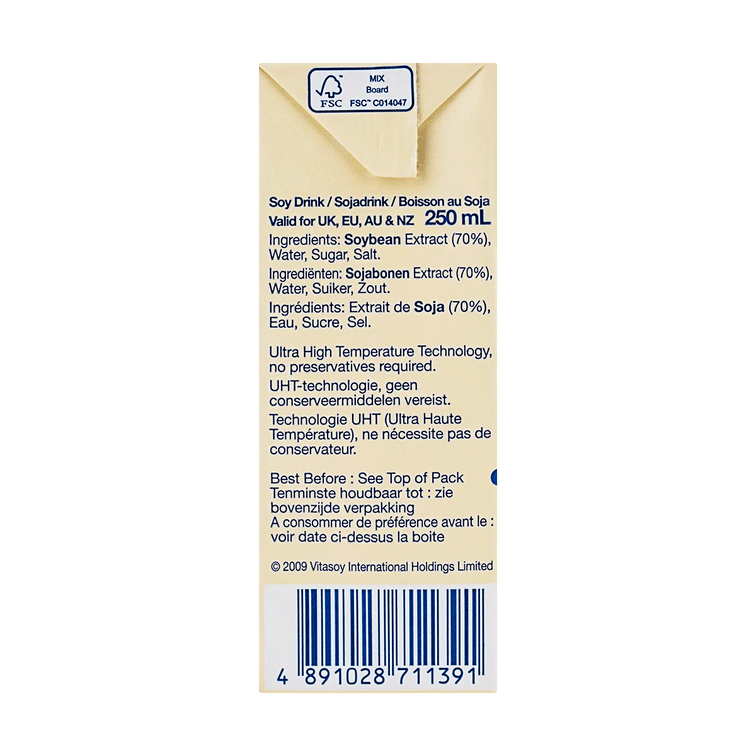 This VITASOY Soy Drinks contains Non GMO Soybeans and is vegan and Dairy free.