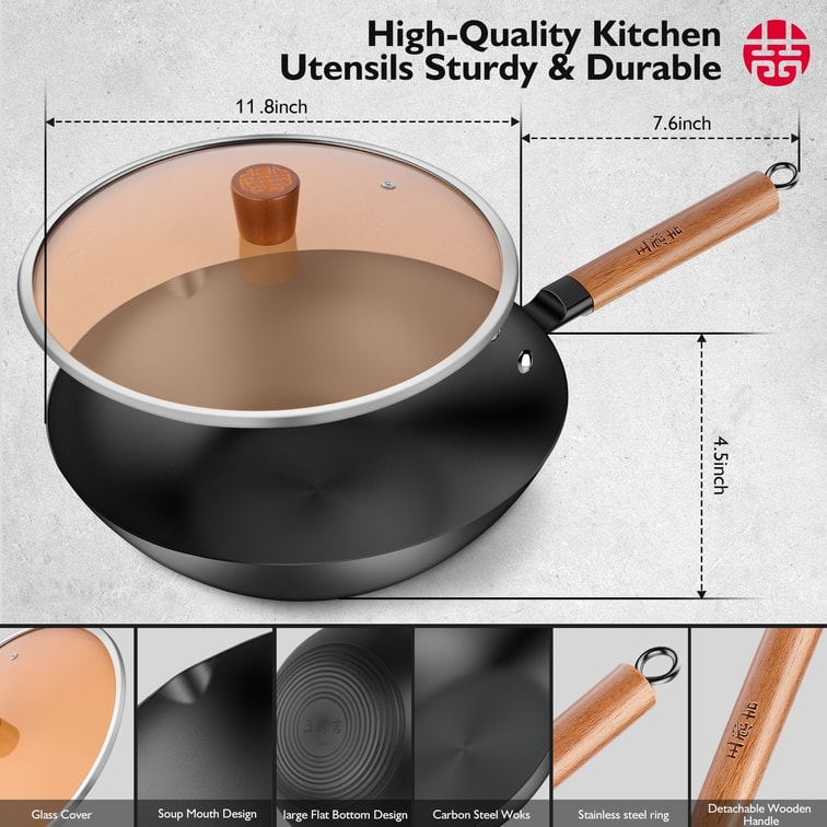 Chinese Carbon Steel Wok With Lid Carbon Steel Pan Flat Bottom No Chemical Coated For All Stoves 30CM