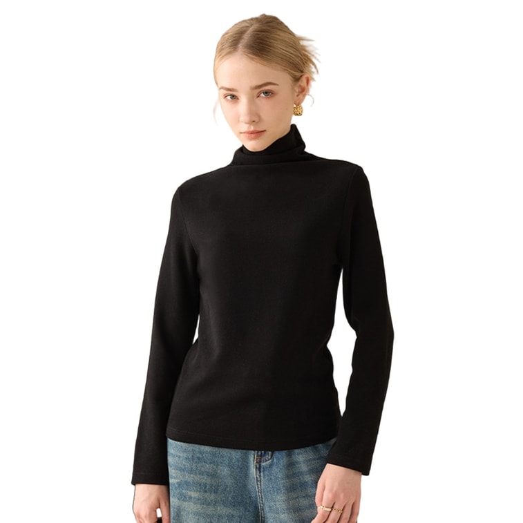 Wool Silk Layering Turtleneck Top, German Fleece Lined Thickened Thermal Base Layer Black M