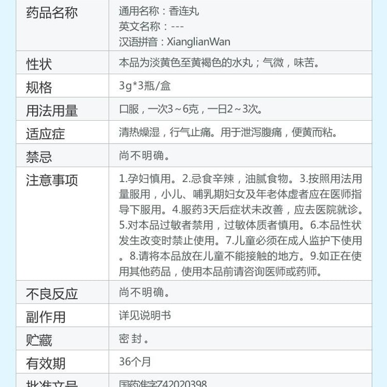 Xianglian pills for clearing heat drying dampness and Qi for pain relief 3g*3 bottles/box | Yami