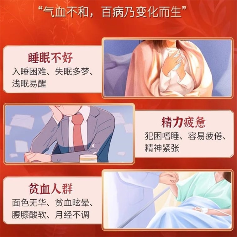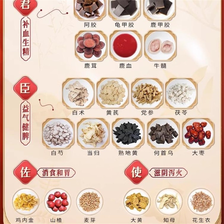 | Concerns | Pale complexion, insufficient qi and blood, insomnia, frequent dreams, dizziness, anemia, soreness and weakness in the waist and knees, postpartum tonification |