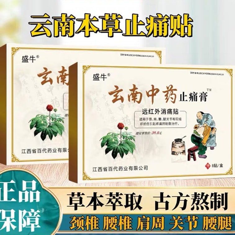 ShengNiu Yunnan traditional Chinese medicine pain relieving plaster for lumbar joint, knee pain, cervical pain, neck and shoulder pain, muscle pain, Wantong Jinggu Tie, 8 pieces | Yami