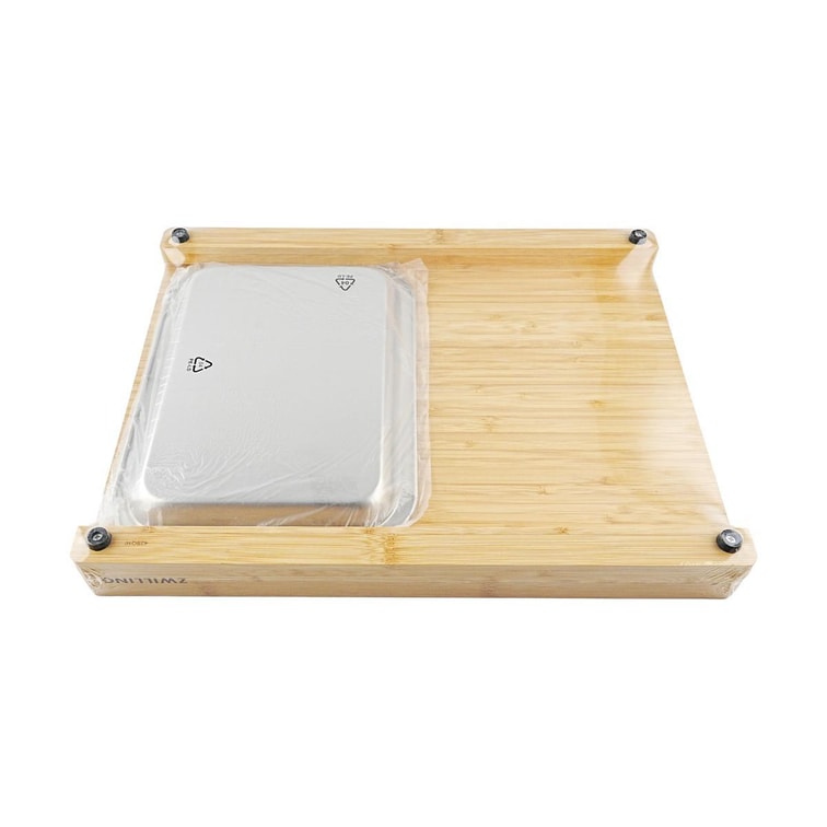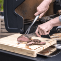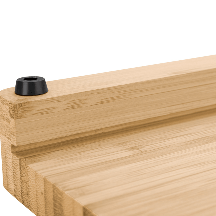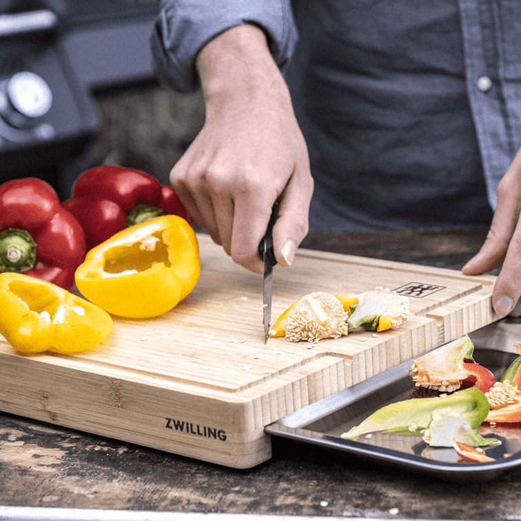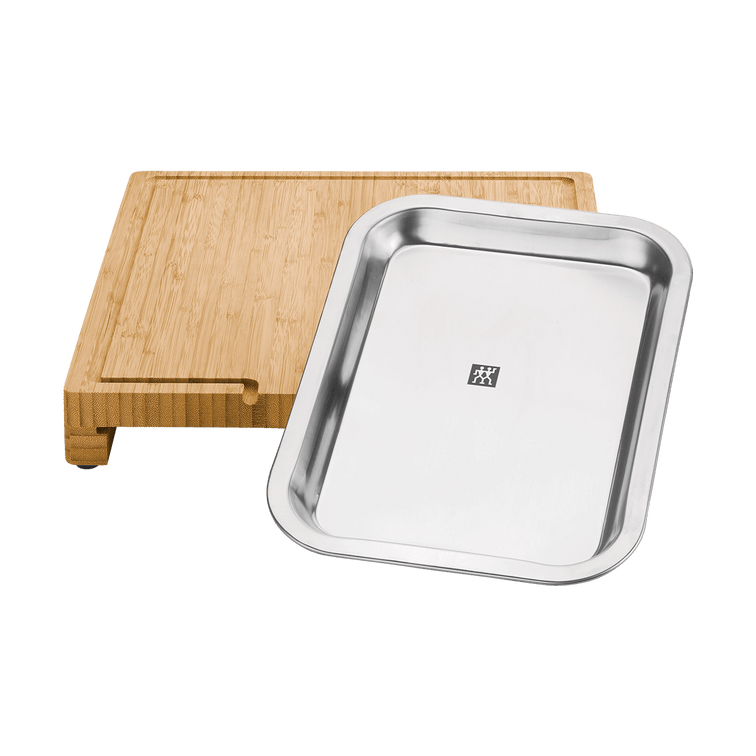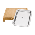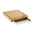 Prep, chop, and organize on this handy cutting board that features a stainless-steel tray drawer that slides out for separating ingredients. Made from FSC-certified premium bamboo, this durable board provides a stable surface for carving even the largest cuts of meat. With grooves to collect juices, the board is an essential when setting up a carving station. The 18/10 stainless steel tray is perfect for catching food scraps or portioning out ingredients for the grill.