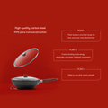 High-quality carbon steel combined with advanced heating technology ensures fast and even heat distribution; it takes less than a minute for the wok to heat up to 356°F, the ideal temperature for stir frying. The Carbonitriding technology makes the wok extremely corrosion-resistant and safe to use with metal utensils. The wok base is suitable for all stovetops, including induction.