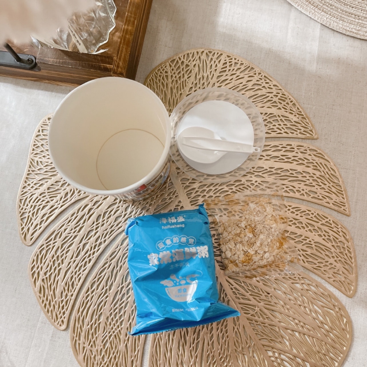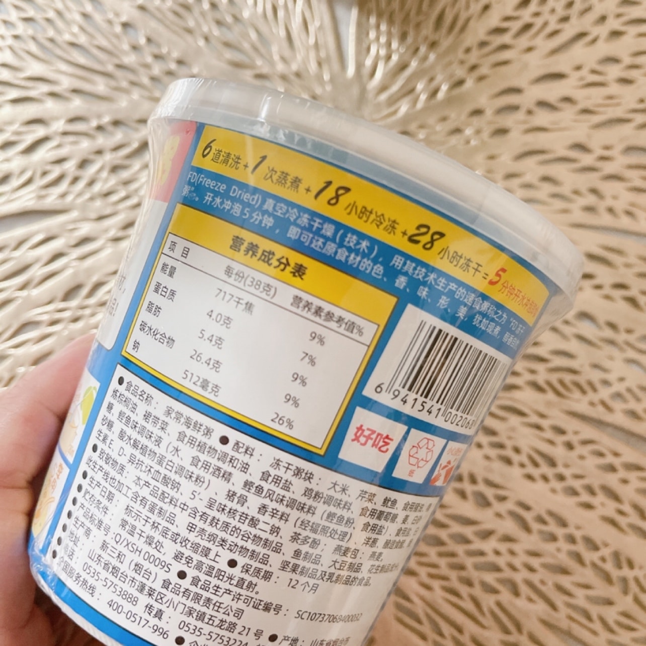 # 好物11道来 # 说是早餐,其实我每次半夜饿了也会泡一罐,方便又好味。因为胃不太好,吃甜的容易反酸烧心。咸粥吃完后也不会,对我太友好了。 偶然间凑单买的,零食柜里放好久。有一回半夜饿了把它翻出来,泡上吃了一口简直“惊为天人”,立马下单又回购了。速食粥做成这样真的很赞。 打开就是一袋冻干海鲜粥,一袋燕麦。加开水泡5分钟就能吃。记得要把水加多一点,要不然会有点咸。饿的时候来上这么一罐,太满足了。 试过海福盛其他肉类冻干粥,但是我觉得那几个有点腥,吃不下去。毕竟我们北方的孩子吃粥不是白粥就是甜粥,咸口的不常见🥹 这个吃的时候让我想到康师傅的鲜虾鱼板面🤣有兴趣的小伙伴买来试一下。毕竟像我家小肉球这么挑剔的宝宝都能吃半罐的粥应该是好味的😋