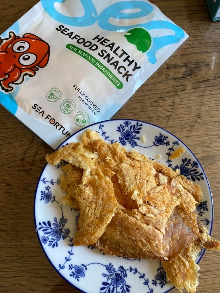 鱿鱼丝纤维细,撕着方便,口感有嚼劲但比虾干轻松不少。味道偏咸,第一口就能感受到咸香在口腔里铺开,越嚼越香。相比虾干来说更有下酒小菜的感觉,分量很足,两条整鱼制成!个别部位有点点细沙,吃的时候需要注意一下!