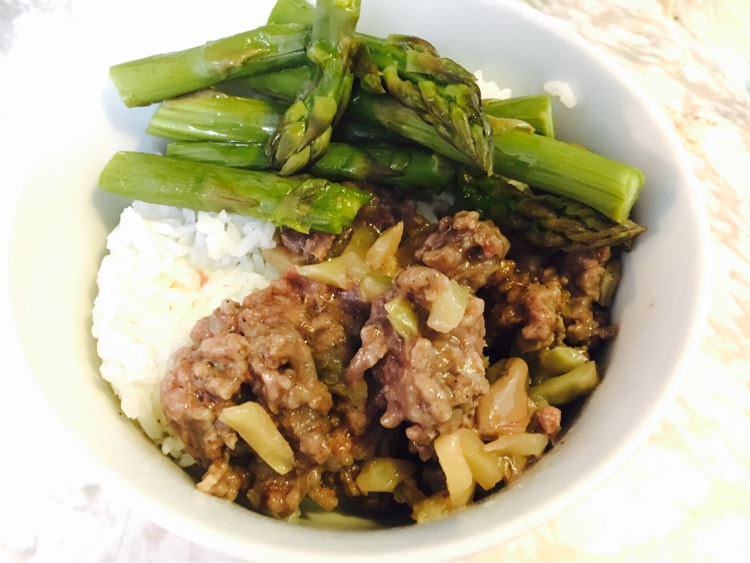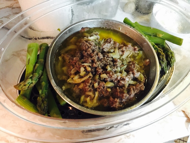 5. Serve in a bowl, remove the patties, and drizzle the remaining beef oil onasparagus, a perfect match.
