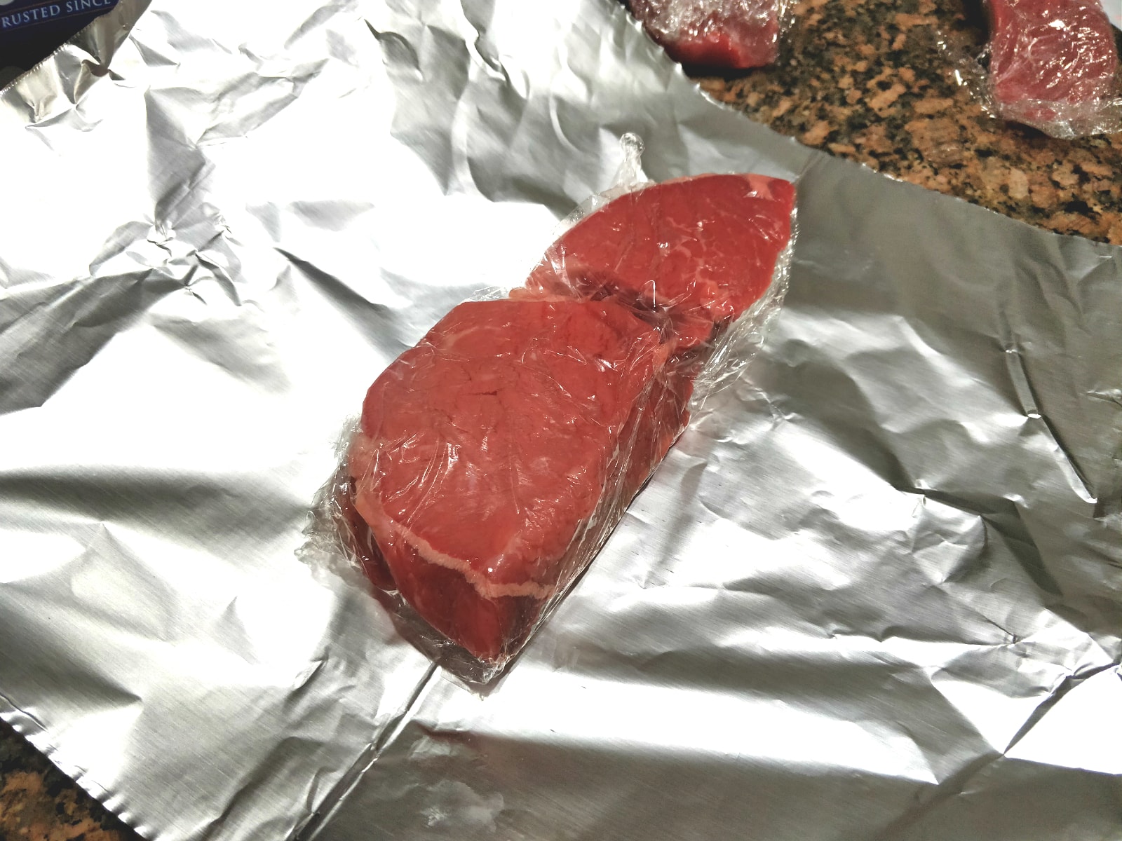 再裹上锡纸~这样放进去冷冻,之后每次要吃的时候室温解冻或者提前一晚放到冷藏室解冻,牛排就跟新鲜的一样啦!
