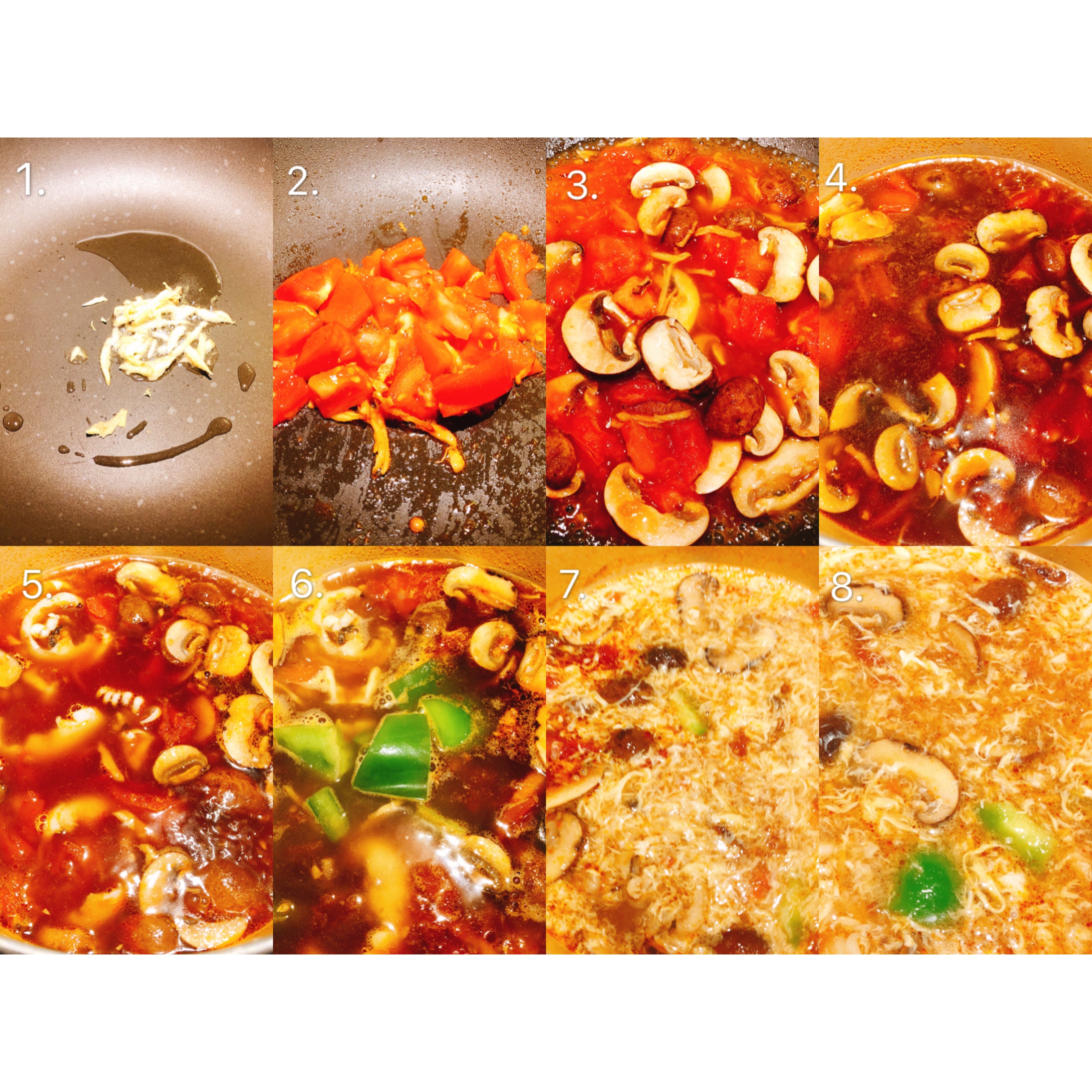 Scallions, ginger, squid, mushrooms, green peppers, tomatoes, eggs