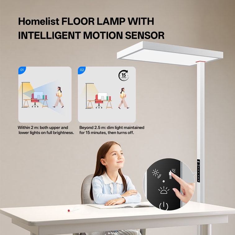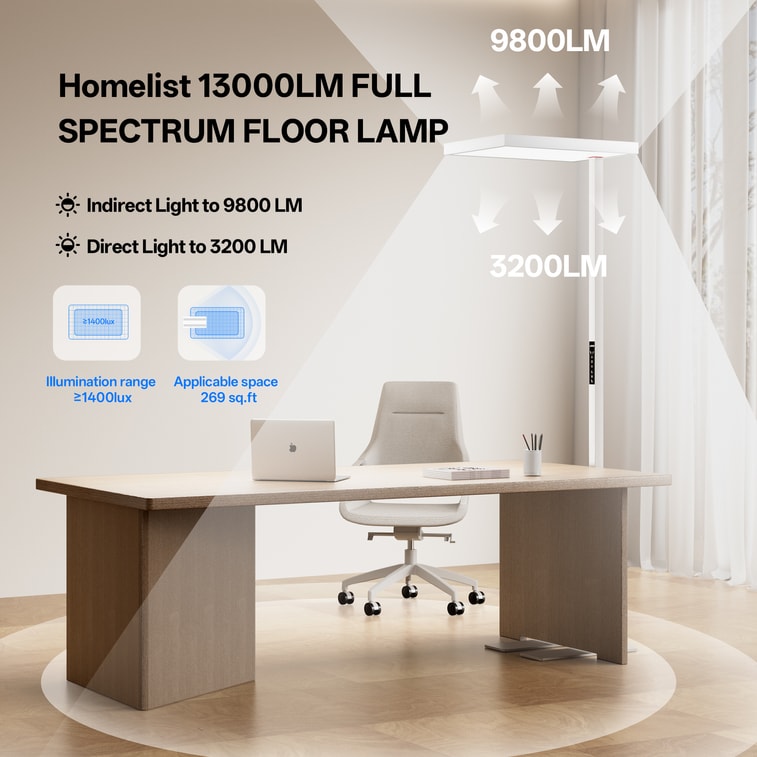 The Homelist SY1 77" Eye Protection Floor Lamp delivers exceptional brightness and intelligent lighting control for modern homes and workspaces. With a 150W equivalent output and up to 13,000 lumens, its dual-beam design combines a 9,800-lumen uplight and 3,200-lumen downlight to evenly illuminate large living rooms, studios, and reading areas.