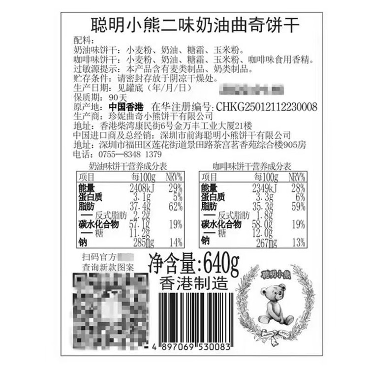 【中国直送】香港ジェニークッキーズ スマートベア ダブルフレーバークッキー 640g×1箱