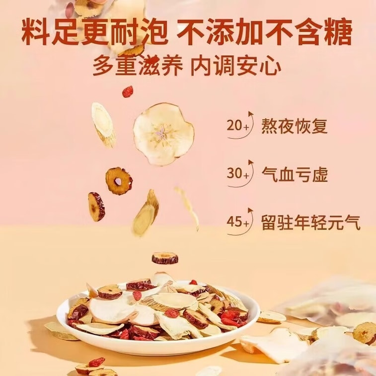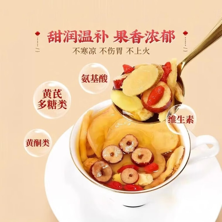 北京同仁堂黄耆リンゴ茶100g、クコの実、ナツメ、オフィオポゴン茶を配合した、女性のための天然美容・活力茶。気血を養い、顔色を良くし、バラ色の輝きを与えます。[三角袋に個包装。高品質な原料が一目瞭然。1日1袋を目安にお召し上がりください。]