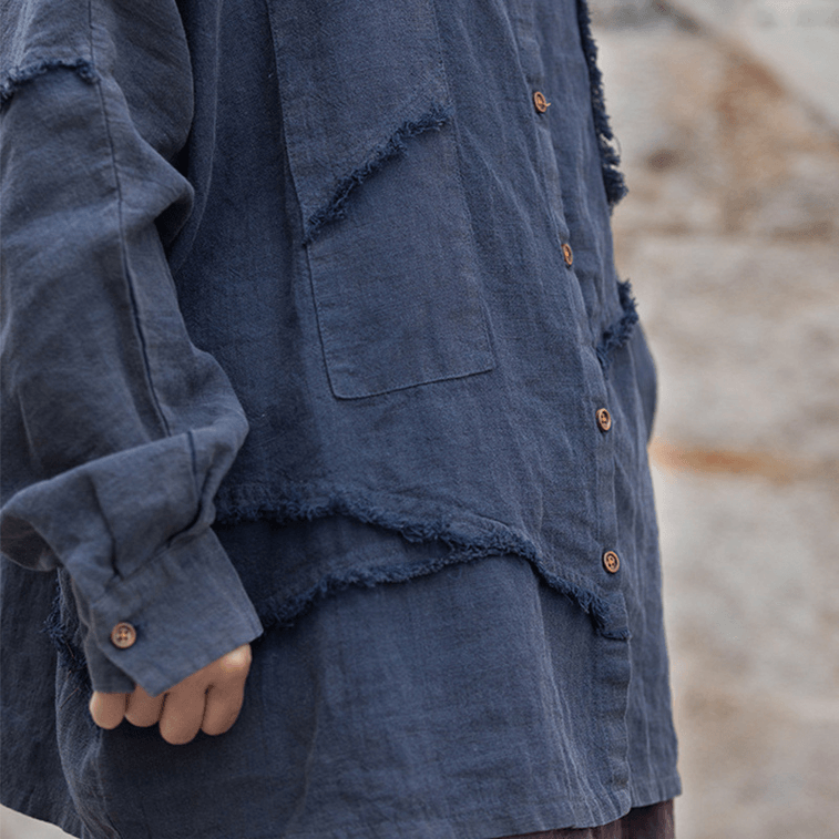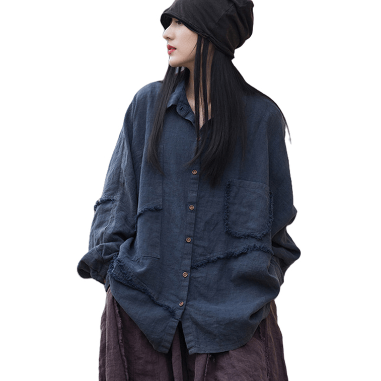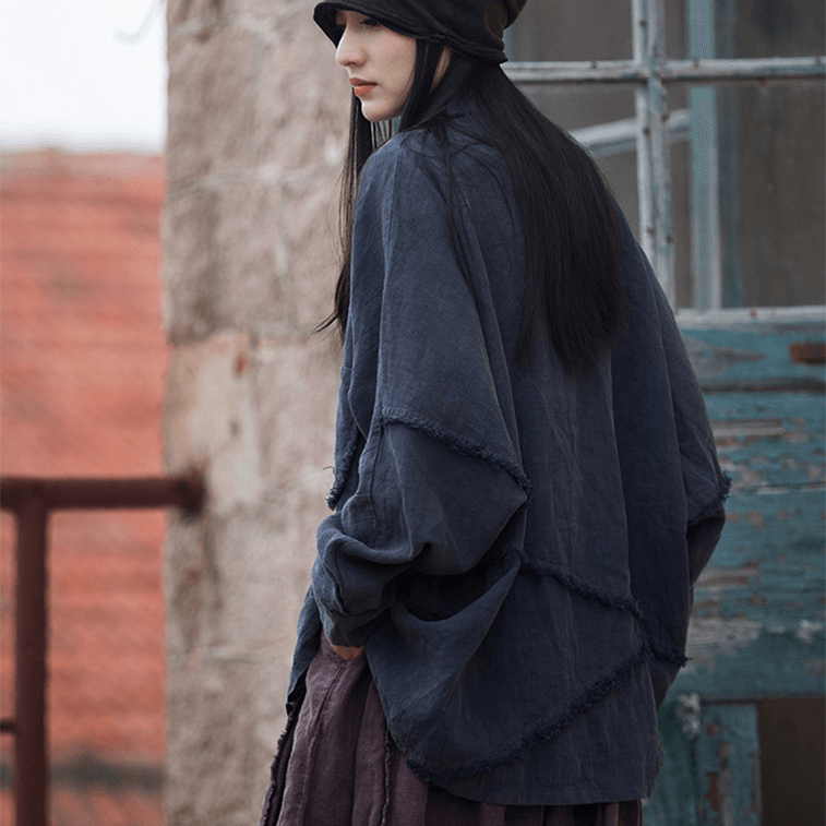 ASIS 中国風コットンとリネンのルーズスプライシング不規則なシャツジャケット、女性用 - ネイビーブルー フリーサイズ