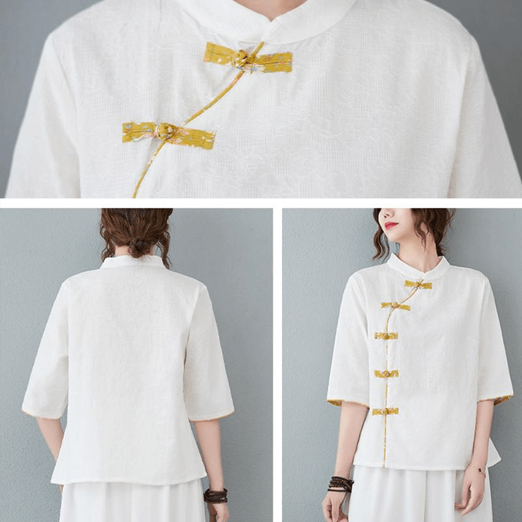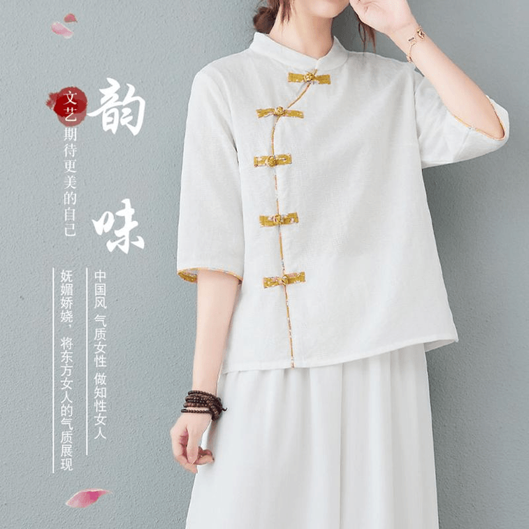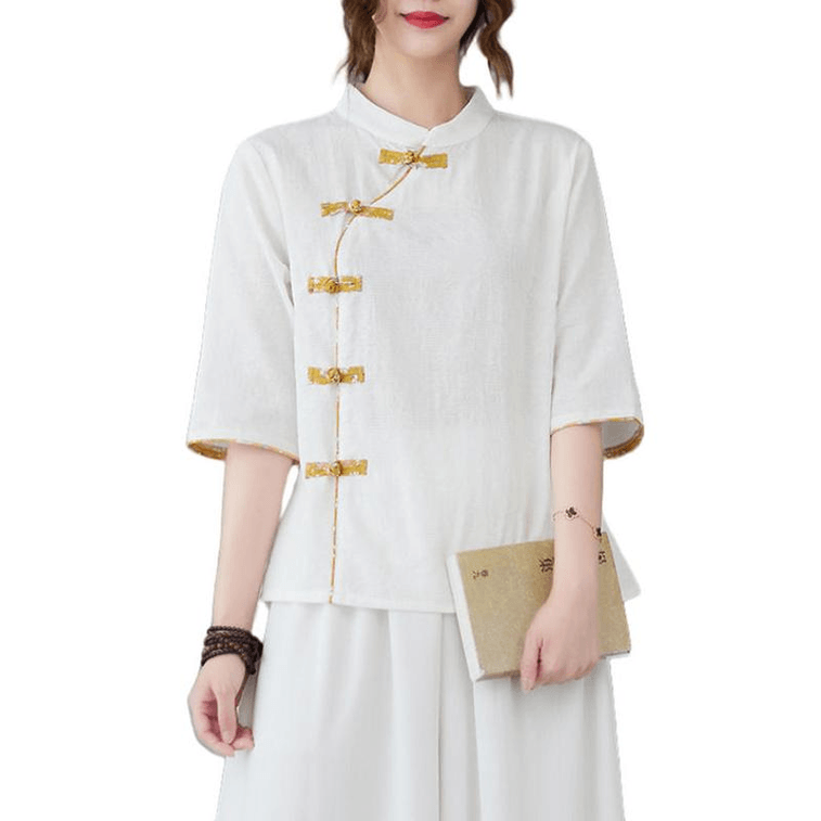 [中国からの直送] ASISスタイル コットン&リネン スラントブレスト ボタン付き ミドルスリーブ シャツトップ - ホワイト M