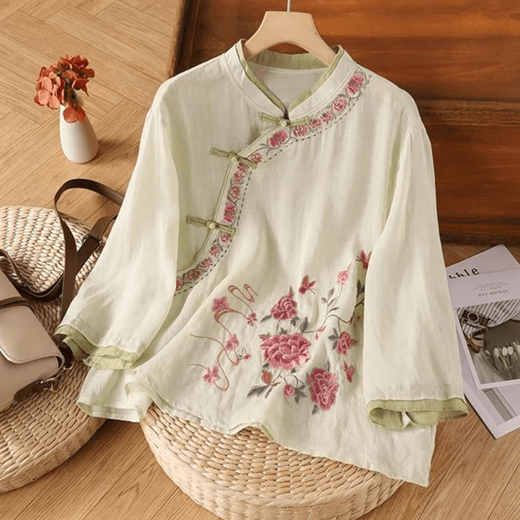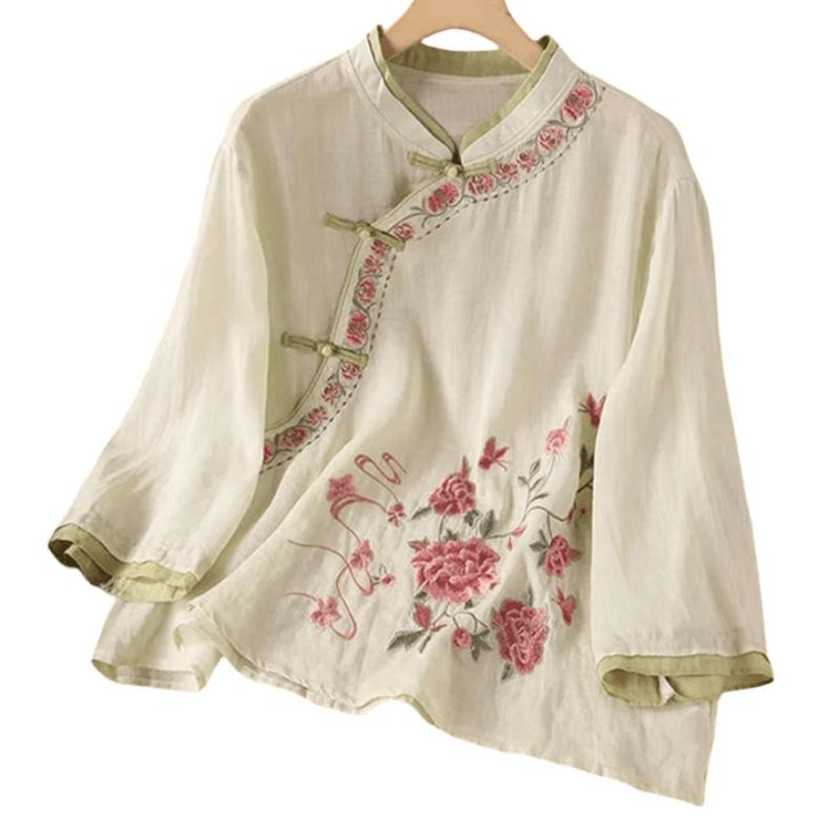 【中国からの直送】ASISスタイル コットン&リネン スラントブレスト 刺繍入りボタン付き七分袖シャツ - アプリコット M