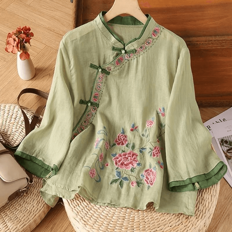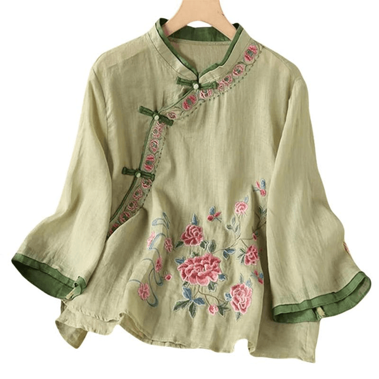 【中国からの直送】ASISスタイル コットン&リネン スラントブレスト 刺繍入りボタン付き七分袖シャツ - グリーン M