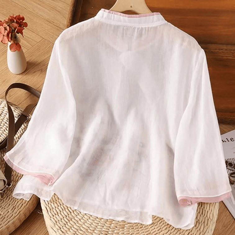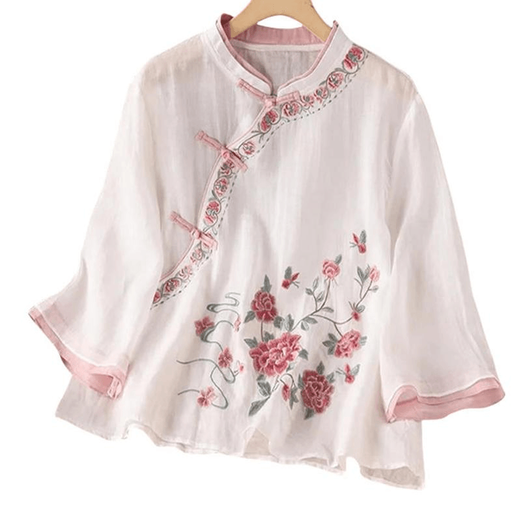 【中国からの直送】ASISスタイル コットン&リネン スラントブレスト 刺繍入りボタン付き七分袖シャツ - ホワイト M