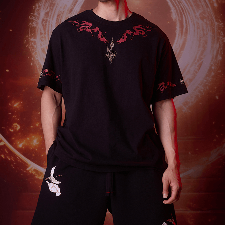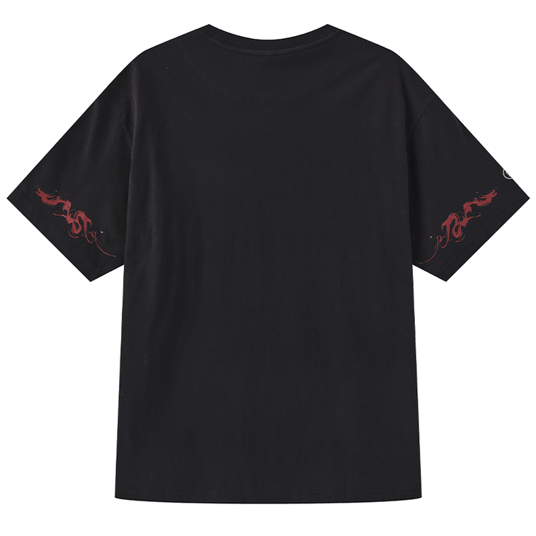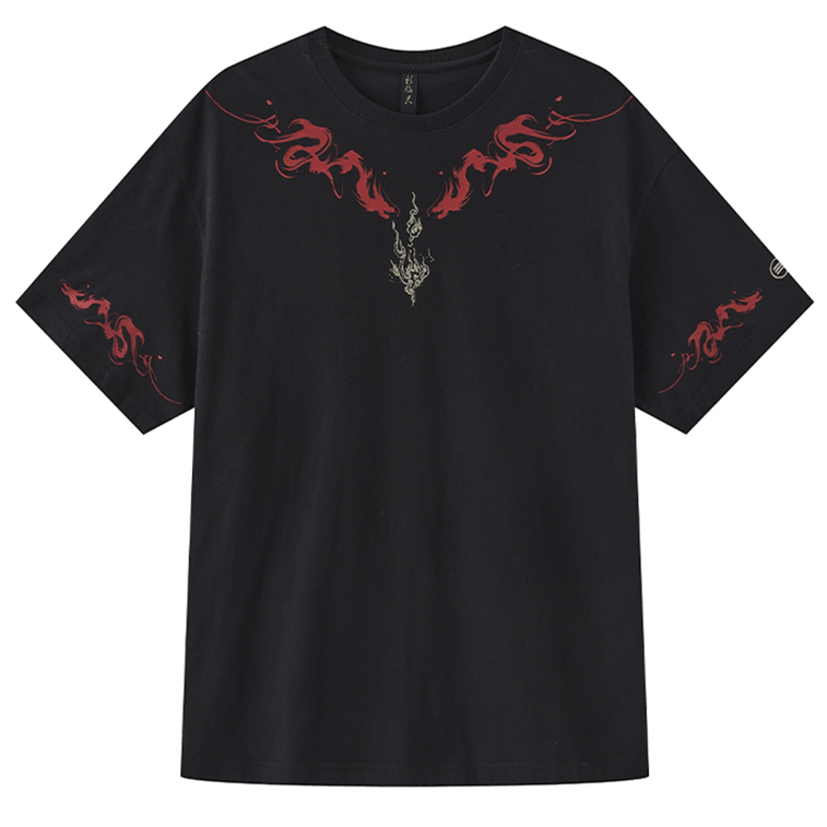 ASIS 中国風火龍プリント刺繍純綿半袖Tシャツ M