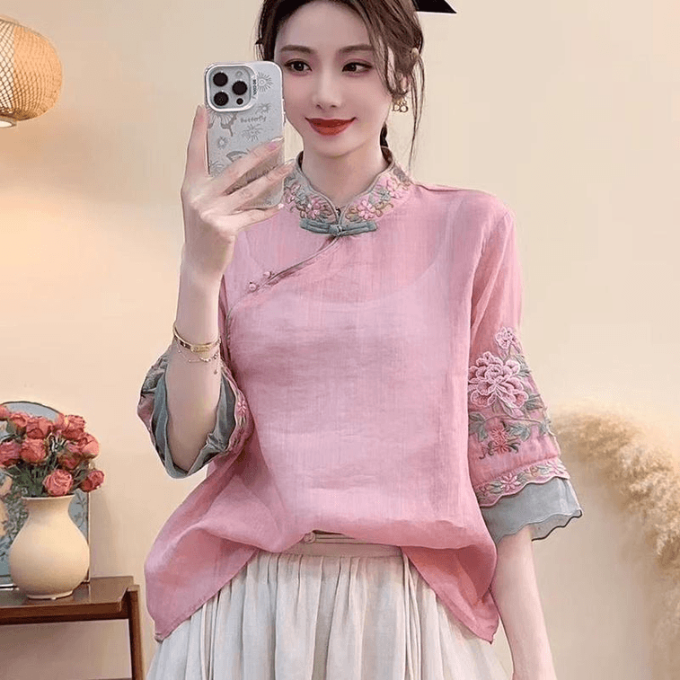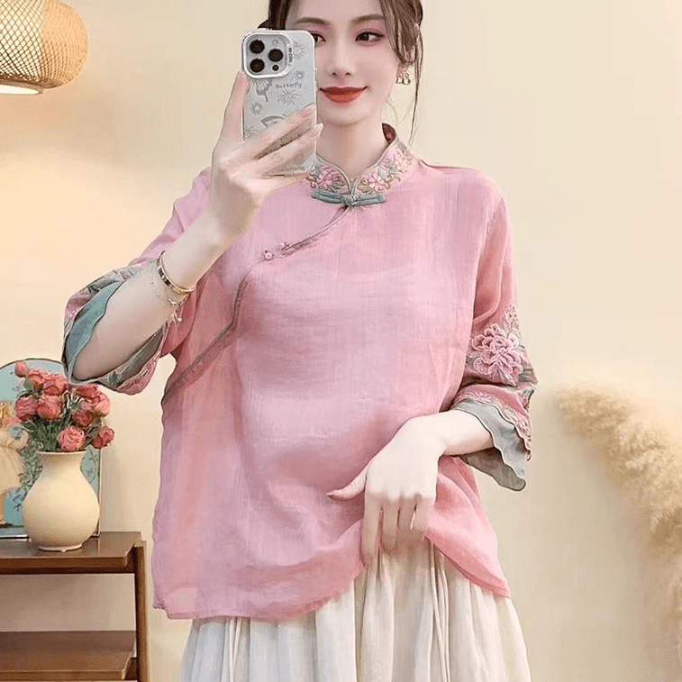 【中国からの直送】ASIS風刺繍ボタンスタンドカラーミドルスリーブシャツ - ピンク M