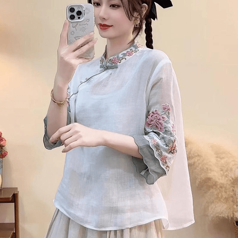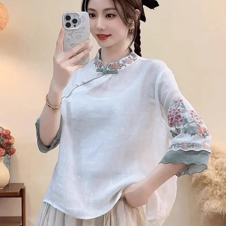 【中国からの直送】ASIS風刺繍ボタンスタンドカラーミドルスリーブシャツ - ホワイト M