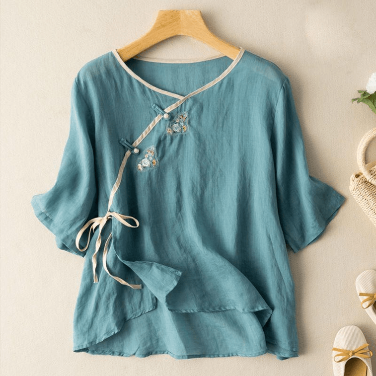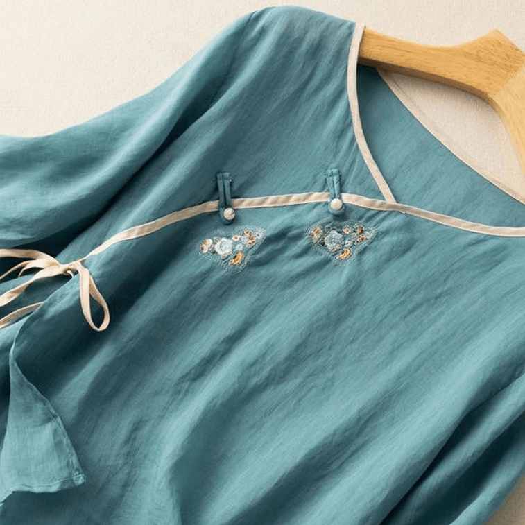 【中国からの直送】ASISスタイル コットン&リネン 半袖刺繍ボタントップTシャツ - ブルー M