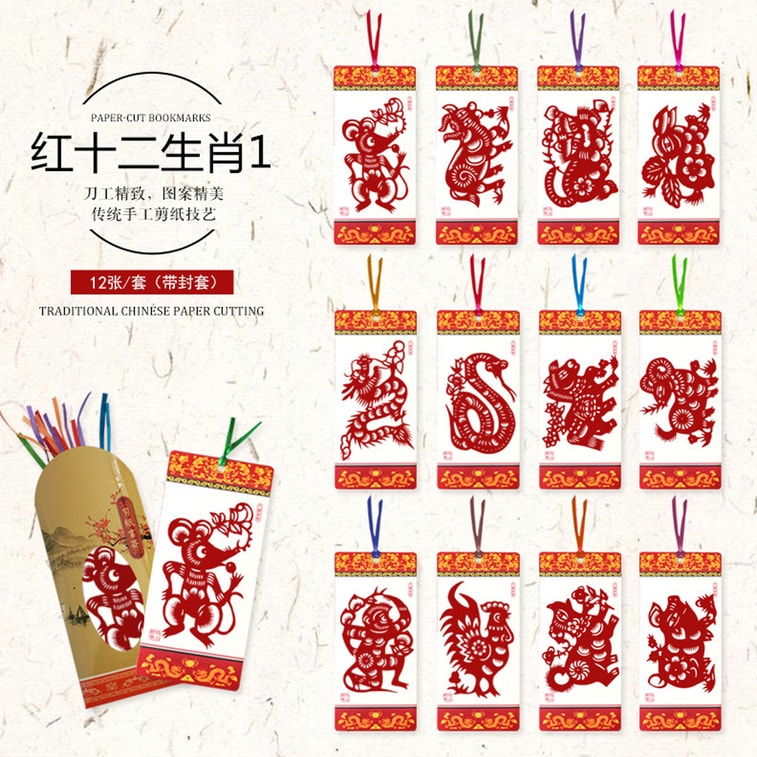 Chinese style hot Paper Cuttings bookmarks Handicrafts with Chinese characteristics Small gifts 12 Chinese zodiac red Paper Cuttings bookmarks set