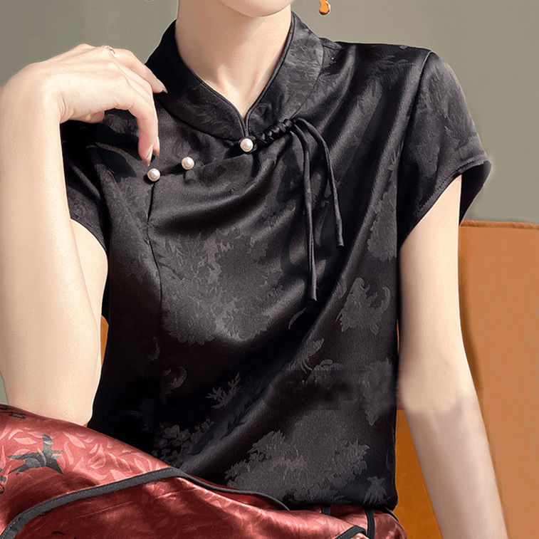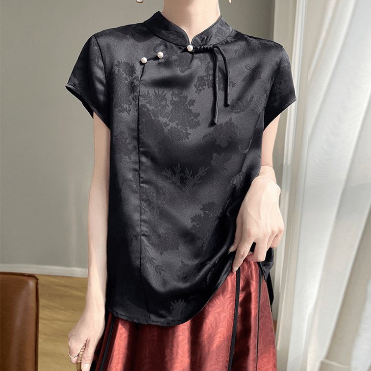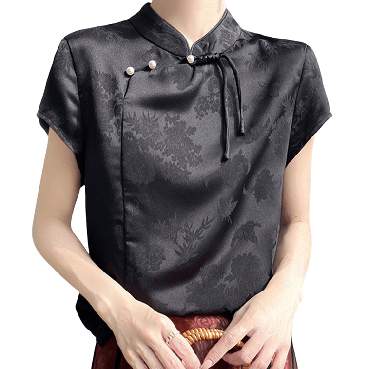 ASIS 中国風の新しい中国ジャカード ディスク ボタン スタンド カラー トップ T シャツ レディース - ブラック XL